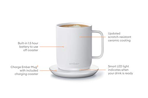 - LONGER-LASTING BATTERY: Extended battery life on your temperature-control mug keeps your drink perfectly hot for 1.5 hours on a single charge – or all day on the included, newly redesigned charging coaster. Choose the exact temperature you prefer (between 48.9°C and 62.8°C).