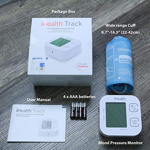 Details: Product Description iHealth Track is a connected arm blood pressure monitor, it is compatible with iPhone, iPad and Android smartphones. The iHealth Track has a colour changing display, it is also easy comfortable and easy to use. With One-Click you can save all your measurements in your MyVitals app account, track data, graphs and history and share results with your coach and friends or healthcare professionals. Box Contains 1 iHealth BP Track blood pressure monitor 1 Cuff 1 user manual 4 AAA Batteries
