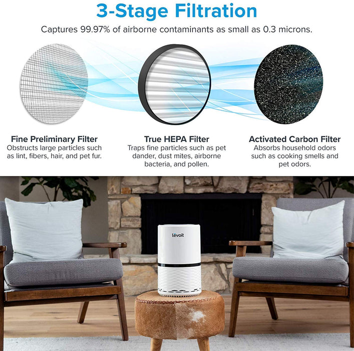 - True HEPA Technology: Levoit's air purifiers have the most reliable 3-Stage Filtration System with Fine Preliminary, True HEPA and Activated Carbon filters reduce 99.97% of dust, pollen, smoke, odours, mould spores, and pet dander