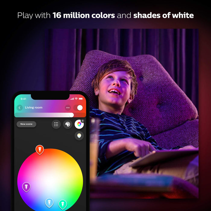 - Turn on imagination - Play with light and choose from 16 million colours. The bulbs have been improved with deeper and richer green, cyan and blue colours for an even better scene setting in your home.