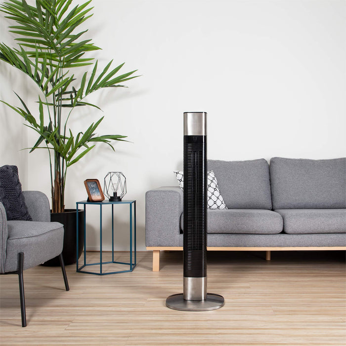 - Powerful and modern 50W tower fan with three speed settings