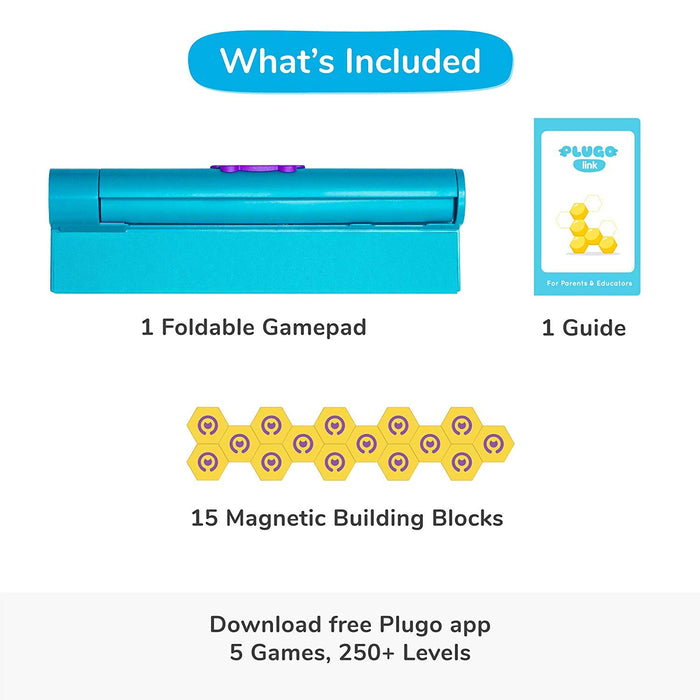 - IN THE BOX - Plugo Link comes with a foldable gamepad and 15 hexagonal building blocks. No Bluetooth and no electronics. The hexagons and the gamepad connect using embedded magnets. A help guide with step-by-step instructions is also included.