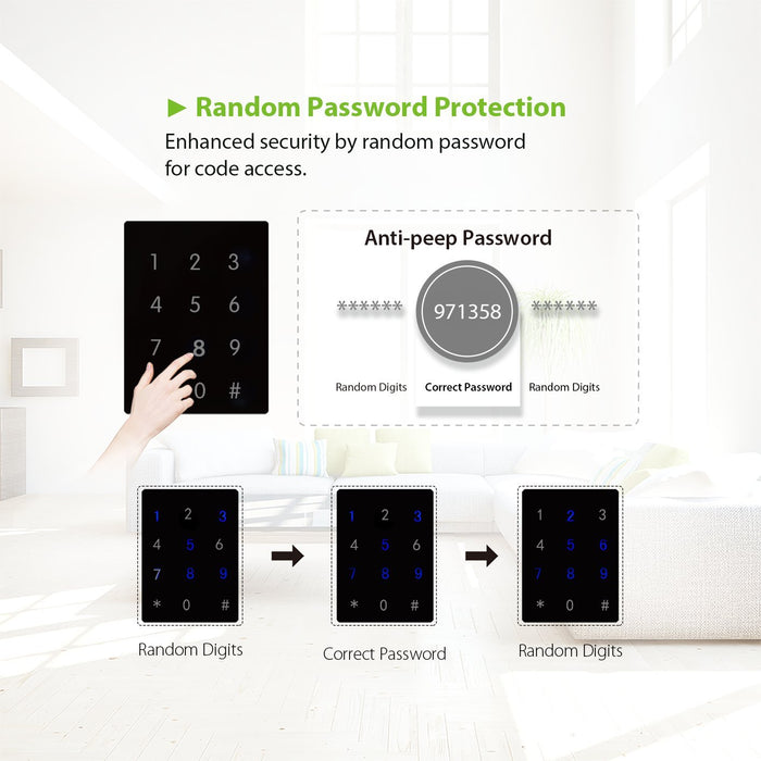 - 🏆【App Function】Four functions of the smart lock .★Code Camouflage, Anti-peep password is random digits +correct digits + random digits .★Remote password, Create a one-time password for your guests,vistors,or house sitters. ★Record Query, you'll always know who opens your door and when .★Special time, Set specific times unlock function for your housecleaners.This security electronic lock will control keyless access